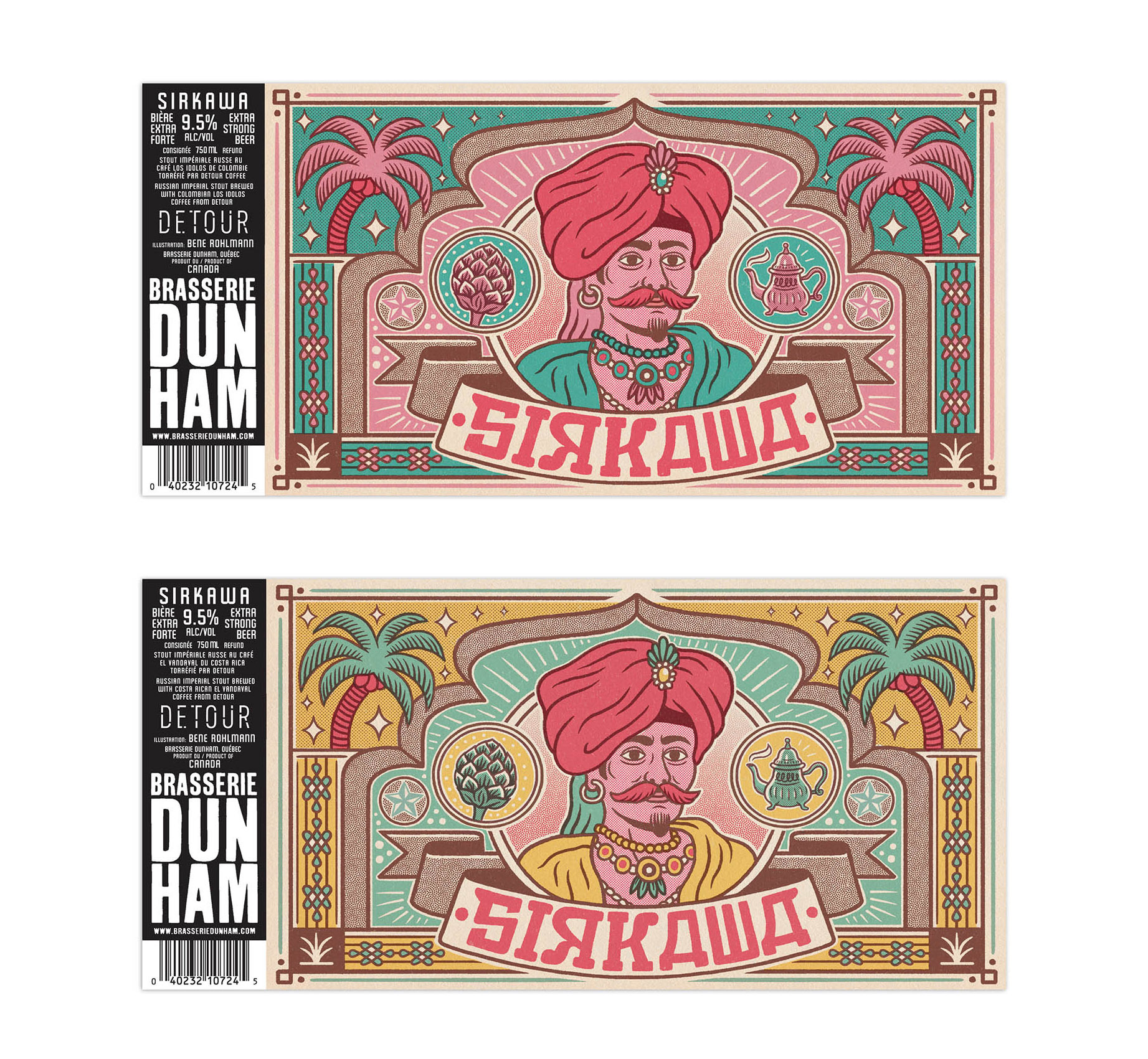 Beer label illustration for a russian stout beer with coffee flavor, for Canadian brewery Brasserie Dunham. There is one version with Colombian and one with Costa Rican coffee, hence the two color versions. Year: 2017