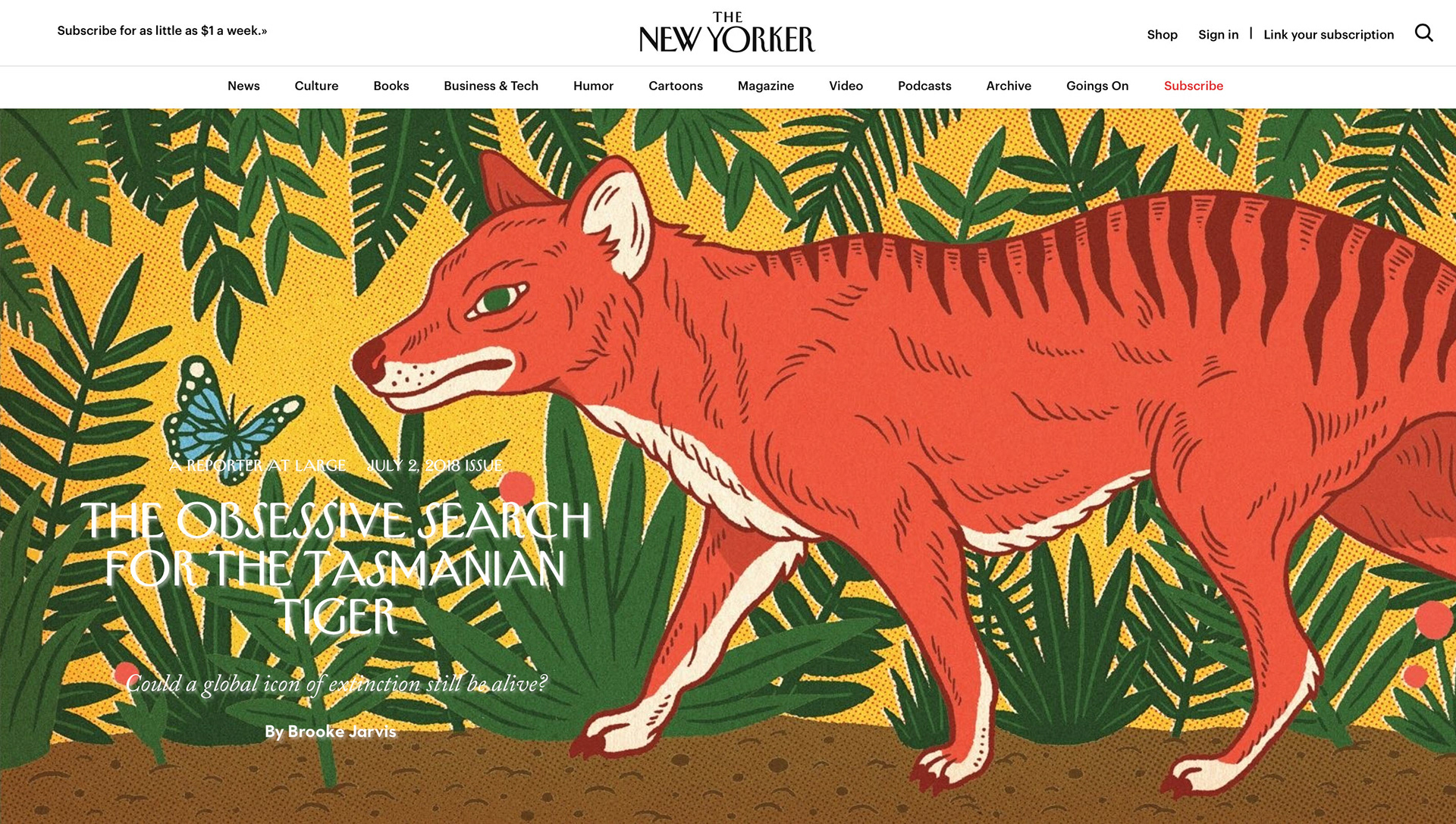 Illustration for The New Yorker, for an article about the extinct Tasmanian Tiger. Year: 2018